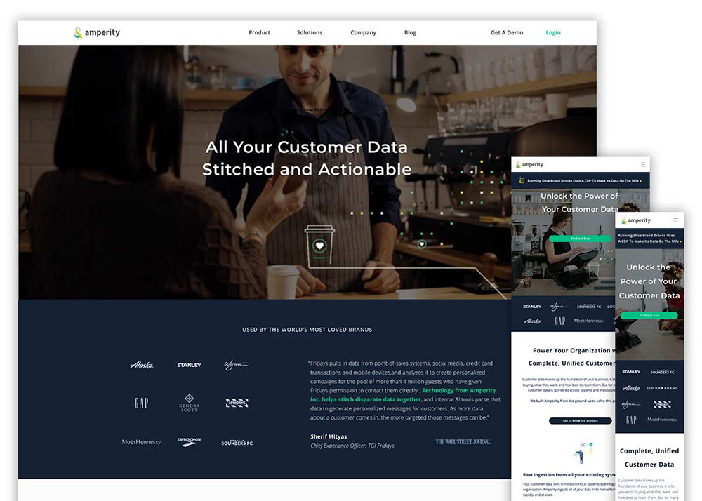 Amperity is a B2B platform that leverages AI to quantify customer data at scale. As the sole developer on the project, I built the site from the ground up using a Model-View-Controller paradigm. It features a seamlessly integrated WordPress blog, a sophisticated URL handling system, advanced .htaccess mods, and connection to a large API ecosystem that includes providers such as Hubspot, Clearbit, and Sendgrid.