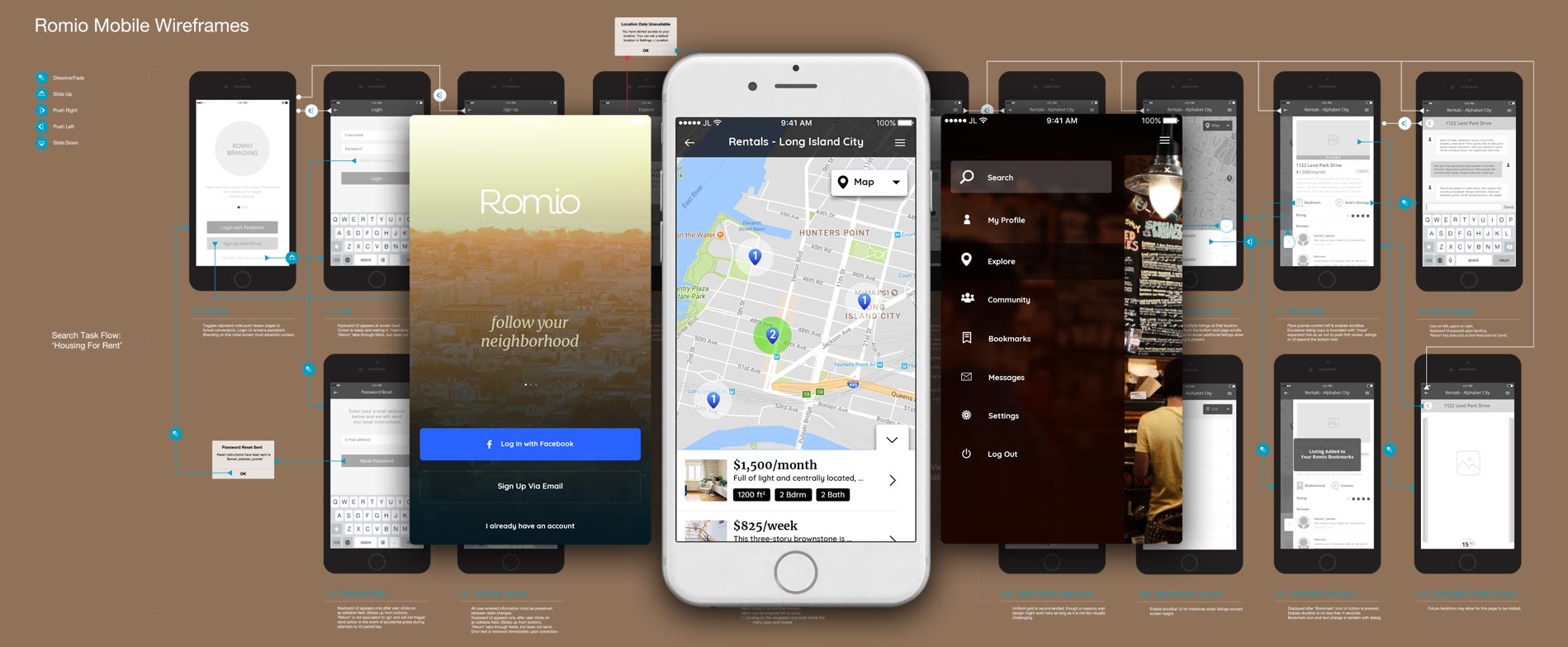 Romio was a neighborhood-focused social media and real-estate startup that consisted of a stand-alone web app with tight integration into Facebook's canvas and social vectors. Shown here is an adaptation of my web user experience design into a design suitable for a mobile app.